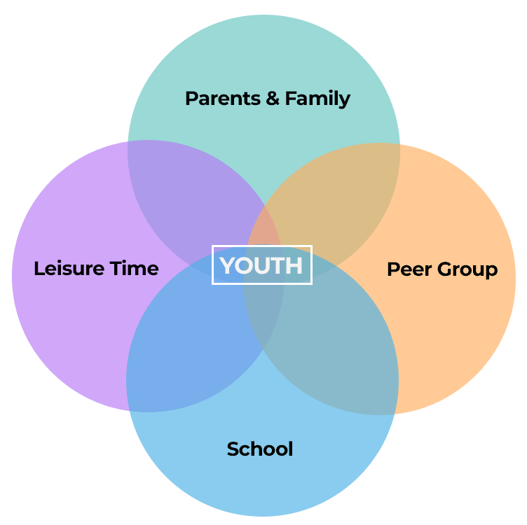 The model focuses on four key factors that can influence youth substance use: their peer group, family interactions, experience in school and how they spend their leisure time.